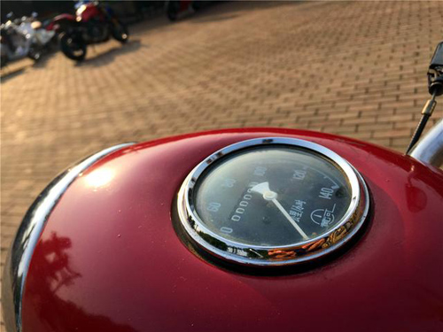 现场这台“黑老鸹”保存得非常完整,原厂配备的打气筒还都在。车头上方红绿色箭头是当时的转向灯。斑斑锈迹见证中国摩托车的发展历程。