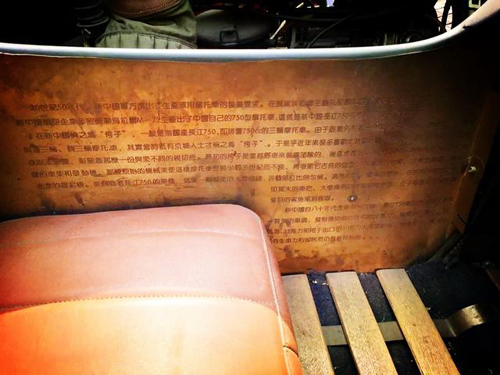 在边车内部,刻有关于长江750的历史简介,可见收藏者对中国摩托车文化的热爱。