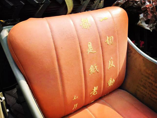 手工真皮车座上秀有:“一切反动派,都是纸老虎”。
