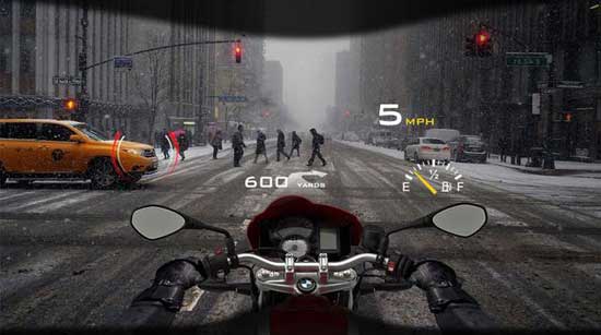 DigiLens设备依靠磁力将其与头盔固定在一起,镜片就在用户眼前,可以实时提供信息更新,比如交通警示、燃料使用情况、速度和引擎功能。外部环境数据将会显示在镜片上,并以360度视角来展示摩托车周围的交通和路况。