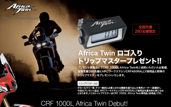 而日本全国前280名购买CRF1000L Africa Twin的车主,更会赠送一组CRF1000L Africa Twin专用的竞技里程表。