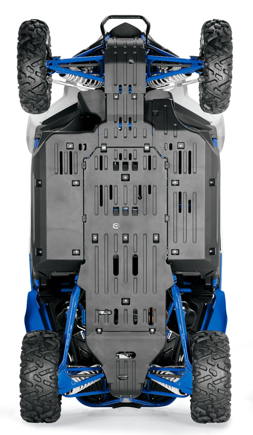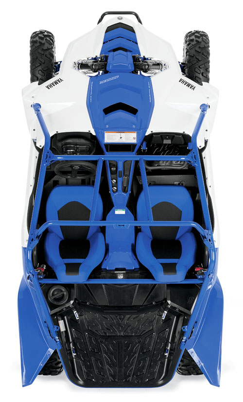 新的 YXZ1000R 采用一副水冷四冲程直列三汽缸、DOHC 每汽缸四汽阀的发动机,达到 11.3:1的压缩比,最大转速则高达 10,500 rpm。油汽混合系统为口径 41 mm 的节汽阀,配以大容量的前置式进汽口。齿轮箱为手动五档,但采用了类似于拉力赛赛车的风格(有点象汽车的自动档设计),带有差速限滑锁系统,可选两轮驱动或者四轮驱动,另配以液压式的离合器。