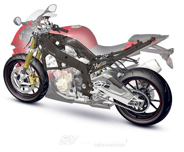 BMW共发布两项碳纤维车架设计专利,其中赛车式车架专为S 1000 RR这样的跑车设计,而编织车架则适合大部分车型,如BMW的R系车型。BMW的碳纤维车架与普通的铝合金车架十分相似,但其内在结构与普通车架却大不相同。在制作赛车式车架时,BMW采用拉伸成型的方法,将碳纤维拉伸成长筒或条形,再将碳纤维从树脂中进行拉伸、加热塑形,最后切割成所需的长度。碳纤维经过拉伸塑成方形截面管,但这一部分并未进行完全处理,还具有可塑性,可以在这一部分可以加入预成型的金属或碳纤维部件。加工完成后,四个较长的拉伸部分构成了车架的主框架,两个短的拉伸部分构成了发动机前支架。最重要的一步是,车架还要在热压罐内进行烘烤以增加其最终强度。最后,再将碳纤维片加入车架的内部和外部,将车架塑造成与普通车架相似的形状。
