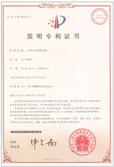 近日,从国家知识产权局(简称SIPO)网站了解到,由三雅公司开发研制的一种新型高效发动机技术经审并通过SIPO审核,被SIPO授权为发明专利,该专利技术名称为:一种中心平衡发动机技术,目前该项专利已广泛应用于三雅NU150发动机系列。