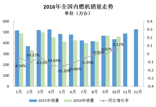 根据中国内燃机工业协会《中国内燃机工业销售月报》重点企业数据显示,数量方面,2016年10月完成内燃机销量460.47万台,环比下降1.32%,同比增长6.12%,累计完成4352.55万台,同比累计下降6.44%;功率方面,2016年10月完成22027.08万千瓦,环比增长2.29%,同比增长20.87%,累计完成功率192257.65万千瓦,同比累计增长12.10%;本月销量较9月有小幅下降,乘用车用、发电用有小幅上涨,商用车、工程、园林及摩托车用内燃机不同程度下降;同比方面船用、园林机械及摩托车用降幅较大;累计销量同比降幅至6.44%;柴油机销量持续低位徘徊,汽油机总体小幅下降。