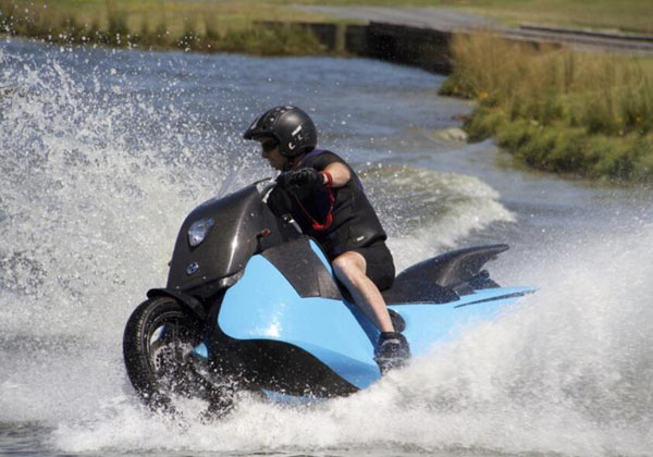该款介于摩托车与喷射快艇的结合物,装载有55匹马力的双缸发动机。宽大的两侧翼板完全能够支撑水面漂浮,水中前轮可以锁死以减轻速阻力。该款车重仅有229公斤,相比 Yamaha TMAX 重了9公斤而已。