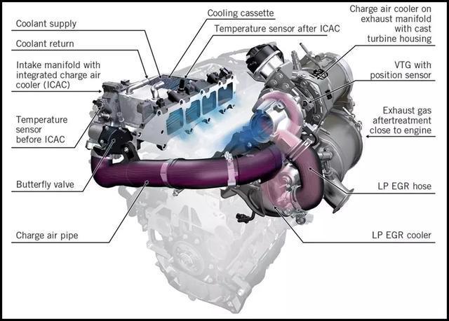 而LP EGR则是在涡轮增压器的前端引入低压高温废气和新鲜空气混合。如此一来废气就能在中冷器获得更好的冷却效果。在经由CVVT的配气处理,就能达到前所未有的气缸降温和氮氧化物减排效果。