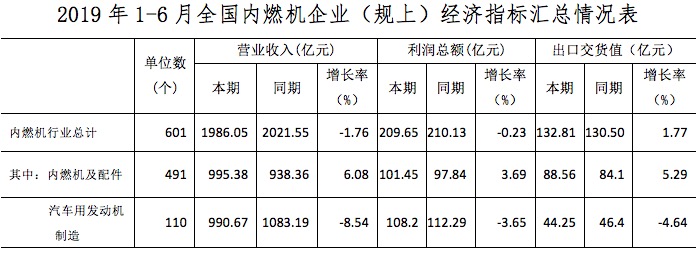 据内燃机工业(含内燃机及配件制造业和汽车发动机制造业)601家独立核算的规上企业汇总数据,前六个月内燃机行业经济运行出现前高后低运行态势,三大指标与上年同期比涨跌互现,除出口交货值保持微弱增长外,营业收入、利润总额均出现负增长。由于不确定性因素较多,经济活力增长略显乏力,减税降费新政利好的影响相对有限,经济下行的风险依然存在。