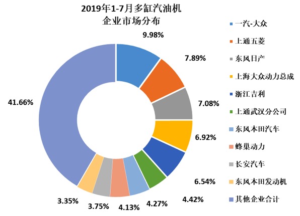 国六标准切换,乘用车市场销量缩水产量下调,多缸汽油机市场下行压力较大。受其影响多缸汽油机7月销量环比小幅上升、同比继续下降。7月销售140.90万台,环比增长5.51%,同比增长-15.83%,累计销量1025.90万台,同比增长-18.87%。在55家多缸汽油机企业中一汽大众、上通五菱、东风日产等十家销量排在前列,其总体销量占行业销量的58.33%。累计销量前十的企业中,上通武汉、东本汽车同比销量为正增长,其余均呈现不同程度降幅,降幅较上月均有所收窄。乘用车用在多缸汽油机占比为97.80%,7月销售137.49万台,环比增长5.07%,同比增长-16.61%,累计销量1003.34万台,同比增长-19.37%。