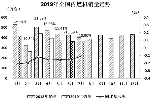据中国内燃机工业协会《中国内燃机工业销售月报》数据, 2019年7月全国内燃机销量与上月基本持平,同比降幅比上月有所收窄。其中柴油机降幅比上月有所减少,汽油机降幅与上月基本持平。1-7月,内燃机市场销量延续了前几个月的下降趋势,柴油机销量降幅继续微量扩大,汽油机销量降幅略有收窄。究其主要原因:排放标准升级、整车市场销量萎缩产量下调;国家治理“大吨小标”等政策持续发酵,商用车销售市场压力较大;工程机械需求放缓及前期高基数;贸易摩擦的影响延续,相关小行业进出口贸易降幅明显。以上等多因素导致对配套内燃机的需求下降。行业经济总体基本平稳运行。