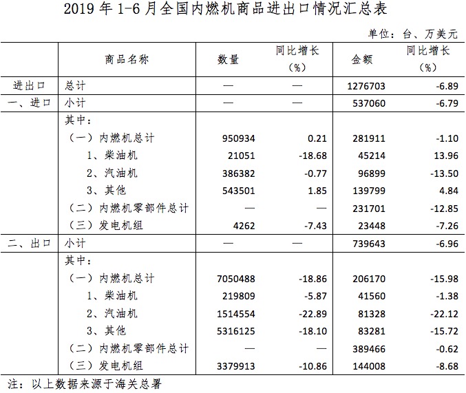 在进口中,仅柴油机保持增长,为13.96%,主要是受船舶用柴油机、机车用柴油机(基数小)进口增长的拉动;汽油机、内燃机零部件分别增长-13.5%、-12.85%,发电机组增长-7.26%;在出口中,各类均为负增长,除柴油机和内燃机零部件降幅较小,分别增长-1.38%、-0.62%外,汽油机和其他类机型降幅较大,分别为增长-22.12%、-15.72%,发电机组增长-8.68%,在柴油机中,增幅明显的是船舶用内燃机,增长12.78%;降幅较大的是机车用柴油机,增长-31.08%;在汽油机中,增幅较大的是车用往复活塞发动机,250ml<排量≤1000ml,增长61.75%,增幅次之的是排量>3000ml车辆用往复式活塞发动机,增长24.49%;而50ml<排量≤250ml及3000≥排量>1000ml车用往复式活塞发动机增长-25.65%、-27.25%,较1-5月降幅扩大。