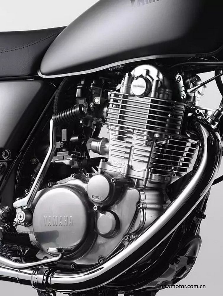 它的恒久魅力很大程度上来源于具有达喀尔拉力赛血统的动力装置。这颗液冷SOHC大单缸,排量为399mL,具有朴素简单、皮实可靠、中低转速动力实用的优点。让人吃惊的是,SR400居然配置的是反冲启动。要知道,启动大单缸从来就不是一件容易的事!不过,雅马哈为之配置了减压装置,让启动任务变得轻松:首先,骑手要拉住离合器杆下面的减压杆,然后打开反冲启动杆,并轻轻踩压,将活塞调整至合适的启动位置。如果你经验不够,可通过小视窗观察活塞位置,当活塞指示器出现在视窗时,这就是合适的启动位置。现在,你就可以释放减压杆了,同时让反冲启动杆完全上升回位。这时,请吸上一口气,因为你的机器已经完全处于待命状态了!猛然踩下反冲脚踏杆,毫不犹豫地快速踩到底,再迅速收脚。伴随着“突突突”的震动节奏,这颗历史超过30年的古老机器,刹那间苏醒复活!