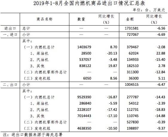 中美贸易摩擦对内燃机行业进出口贸易影响延续。
