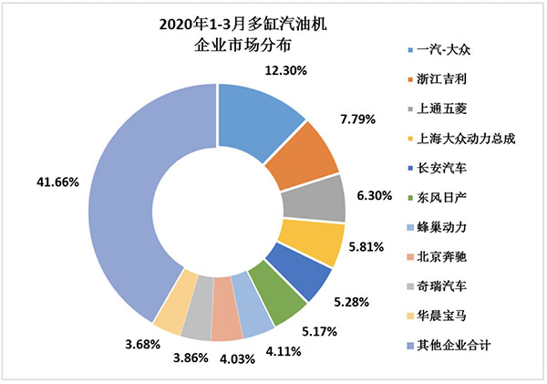 多缸汽油机主要配套乘用车市场3月产销较上月有所好转,但由于市场下滑严重,整体仍处于较低水平。多缸汽油机销量环比增长,同比、累计同比大幅下降,累计销量不足去年六成。3月销售101.45万台,环比增长432.85%,同比增长-44.83%;1-3月累计销量260.45万台,同比增长-44.02%。在55家多缸汽油机企业中一汽大众、浙江吉利、上汽通用五菱等十家销量排在前列,其总体销量占行业销量的58.34%。乘用车用在多缸汽油机占比为96.19%,3月销售98.66万台,环比增长495.90%,同比增长-45.04%;1-3月累计销量250.52万台,同比增长-45.00%。企业的降幅区间主要集中在-30%~-50%,随着各地陆续恢复正常状态,这一现象相信会逐渐好转。