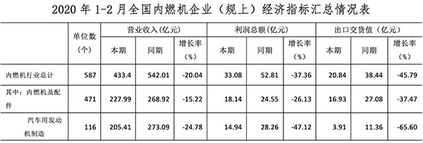 新冠肺炎这一突发事件对行业影响巨大,1-2月内燃机工业经济总体出现了大幅下滑。据内燃机工业(含内燃机及配件制造业和汽车发动机制造业)587家规模以上汇总数据, 1-2月内燃机行业主营业务收入433.4亿元,同比增长-20.04%,其中:内燃机及配件行业227.99亿元,同比增长-15.22%,汽车发动机制造业205.41亿元,同比增长-24.78;利润总额33.08亿元,同比增长-37.36%,其中:内燃机及配件行业18.14亿元,同比增长-26.13%,汽车发动机制造业14,94亿元,同比增长-47.12%;出口交货值20.84亿元,同比增长-45.79%,其中:内燃机及配件行业16.93亿元,同比增长-37.47,汽车发动机制造业3.91亿元,同比增长-65.60%。
