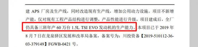 我们此前曾曝光过一汽-大众投产1.5TSI evo发动机的消息。相关文件显示,一汽-大众成都工厂的1.5TSI evo发动机技术改造项目已经在2019年8月向属地发改局备案,项目建成后,1.5TSI evo发动机的产能可达60万台/年。后续,该发动机将会代替大众使用多年的EA211 1.4TSI发动机,应用到一汽-大众旗下大众品牌新车和捷达品牌车型上。