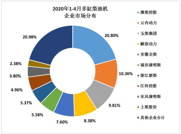 多缸柴油机主要配套的商用车市场,同比增长较为明显,产销量创月度历史新高。4月,多缸柴油机企业共销售51.37万台,环比增长14.95%,同比增长25.35%;1-4月累计销量148.38万台,同比增长-8.37%。特别值得指出的是潍柴、云内、解放动力、福田康明斯、上柴累计销量处于正增长态势。分企业看,潍柴、云内、玉柴、解放动力、全柴、福康、新柴、江铃、东康、上柴前十名销量占总销量的79.02%;市场份额占比中:潍柴20.80%、云内10.36%、玉柴9.81%、解放动力8.38%、全柴7.60%、福康5.58%、新柴5.37%、江铃4.96%、东康3.80%、上柴2.38%。