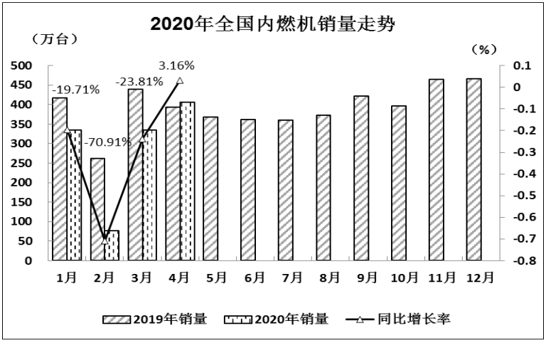 随着国内疫情防控形势逐渐好转及行业复工达产率的提升,2020年4月全国内燃机销量恢复至常年水平,同比环比增长,累计销量下降幅度较上月收窄。