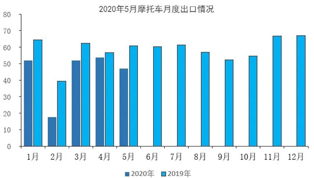 5月,全球疫情持续蔓延,对我国摩托车出口影响较大,摩托车产品出口量持续下滑。