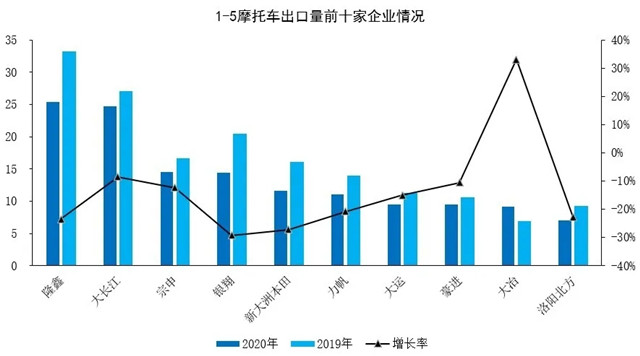 1-5月,摩托车出口量排名前十位的企业依次为:隆鑫、大长江、宗申、银翔、新大洲本田、力帆、大运、广州豪进、大冶、洛阳北方,上述十家企业共出口137.22万辆,占摩托车出口总量的61.31%。