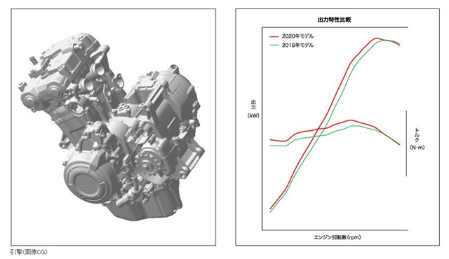 CBR400R配备399cc排量的水冷直列双缸发动机,最大功率34Kw [46ps] / 9,000,最大扭矩38Nm / 7,500rpm,在低转速范围内具有强劲的发力特性,这是日常运动中最常用的,高转速范围同样具有强劲的性能。另外,本田通过优化喷射系统,还可以对与节气门开度线性相关的特性进行优化,极大的增加了燃油效率,2.5L的百公里油耗,配合17L的大油箱,续航能力可想而知。