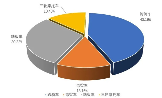 上半年,跨骑车产销310.81万辆和311.9万辆,同比下降21.27%和20.85%;踏板车产销212.82万辆和218.23万辆,同比增长16.4%和21.62%;弯梁车产销94.37辆和95.06万辆,同比下降13.99%和12.95%。从各车型销量占二轮车总销量的比重看,跨骑、踏板和弯梁三类车型占比分别为49.89%,34.91%,15.21%;与去年同期相比,增长变化分别为-7.83%,8.62%,-0.79%。