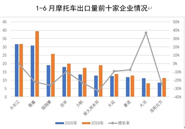 上半年,摩托车出口量排名前十位的企业依次为:大长江、隆鑫、银翔、宗申、力帆、新大洲本田、大运、广州豪进、大冶、洛阳北方,上述十家企业共出口169.46万辆,占摩托车出口总量的61.16%。