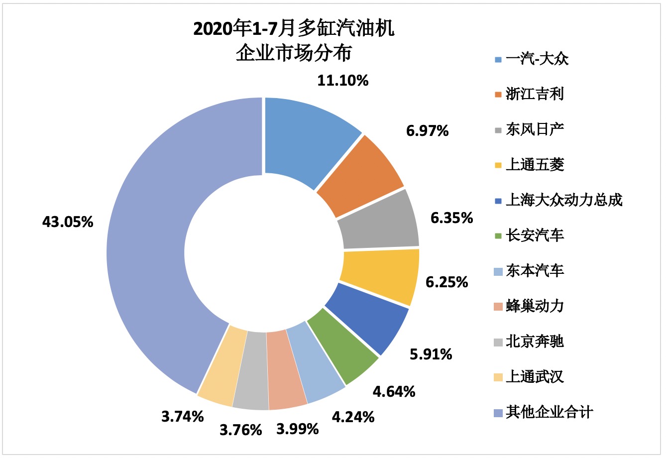 多缸汽油机主要配套的乘用车市场7月产销持续回升,环比小幅下降,同比继续保持增长。受其影响,多缸汽油机销量环比小幅下降,同比增长,累计同比降幅继续收窄。7月销售165.10万台,环比增长-2.36%,同比增长17.26%;1-7月累计销量905.34万台,同比增长-11.26%。在55家多缸汽油机企业中一汽大众、浙江吉利、东风日产等十家销量排在前列,其总体销量占行业销量的56.95%。乘用车用在多缸汽油机占比为96.48%,7月销售159.17万台,环比增长-2.66%,同比增长15.85%;1-7月累计销量873.46万台,同比增长-12.45%。企业的累计销量降幅区间主要集中在0%~-20%,降幅已较上月明显好转。
