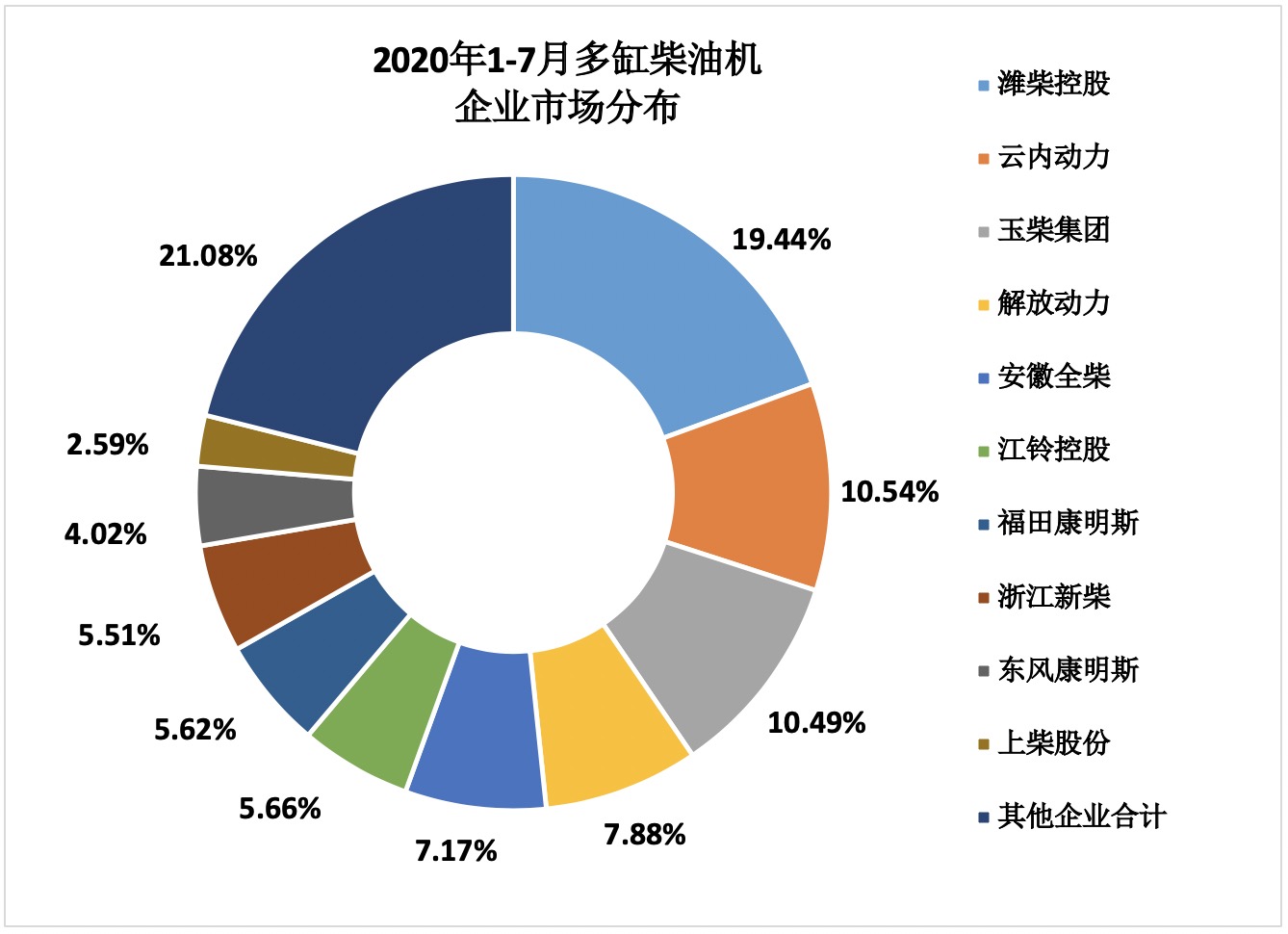 多缸柴油机主要配套的商用车市场同比高速增长,带动多缸柴油机市场也出现较大增幅。7月,多缸柴油机企业共销售46.20万台,环比增长-6.35%,同比增长69.30%;1-7月累计销量295.63万台,同比增长15.37%。特别值得指出的是云内、上柴、东风商用车、一拖洛阳、广康等累计同比增幅均在30%以上。分企业看,潍柴、云内、玉柴、解放动力、全柴、江铃、福康、新柴、东康、上柴前十名销量占总销量的78.92%;市场份额占比中:潍柴19.44%、云内10.54%、玉柴10.49%、解放动力7.88%、全柴7.17%、江铃5.66%、福康5.62%、新柴5.51%、东康4.02%、上柴2.59%。