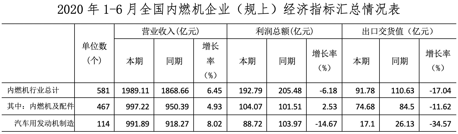 据国家统计局内燃机工业581家独立核算的规模以上企业(含467家内燃机及配件制造业和114家汽车发动机制造业)汇总数据,上半年由于新冠肺炎影响内燃机行业经济运行整体质量不及预期,随着企业生产经营的恢复,情况逐月好转,截至6月,主营业务收入已实现正增长,利润总额和出口交货值虽然负增长,但降幅收窄,利润总额降幅已收窄至10%之内。